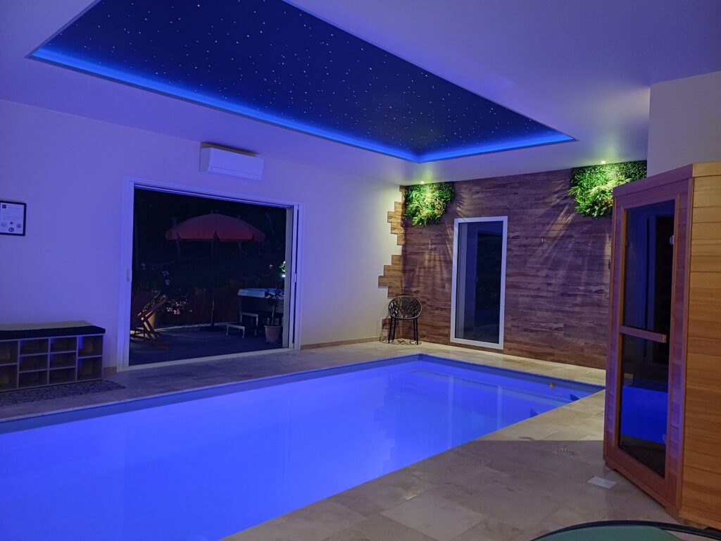 découvrez la piscine intérieure avec son eau chauffée à 30°, le Sauna Lounge et le jacuzzi extérieur chauffé à 38°