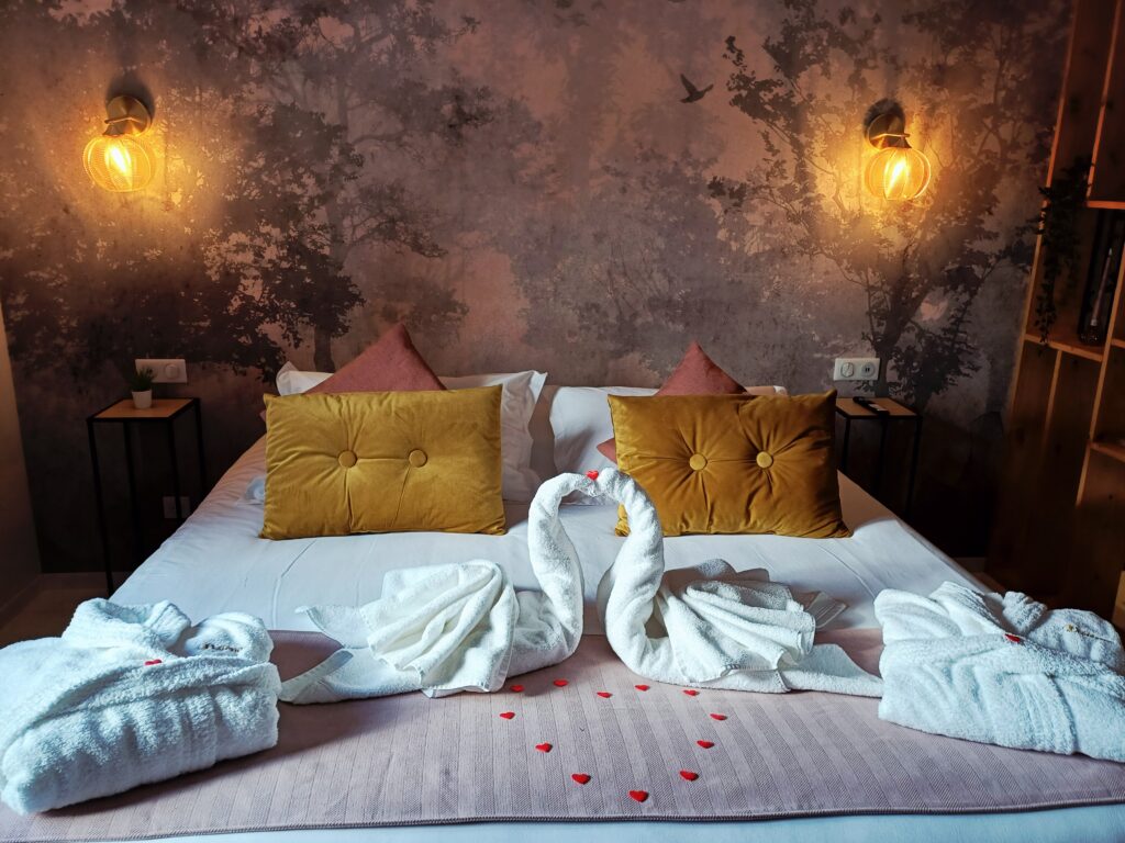 Une suite haut de gamme à la décoration Romantique et Nature avec Spa et Sauna privatif dans la suite, lit King-Size, Balcon avec Vue sur la Nature.